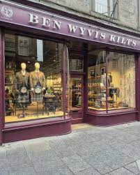 Purple-painted shop facade of Ben Wyvis Kilts, showcasing Highland dress Though a bit outside Inverness, Ben Wyvis Kilts is worth the drive. I had a chance to see their small workshop and was impressed by the personal touch. They’re one of the few places still cutting, stitching, and pressing kilts by hand. Their team works with military groups, pipe bands, and individuals looking for made-to-measure garments.