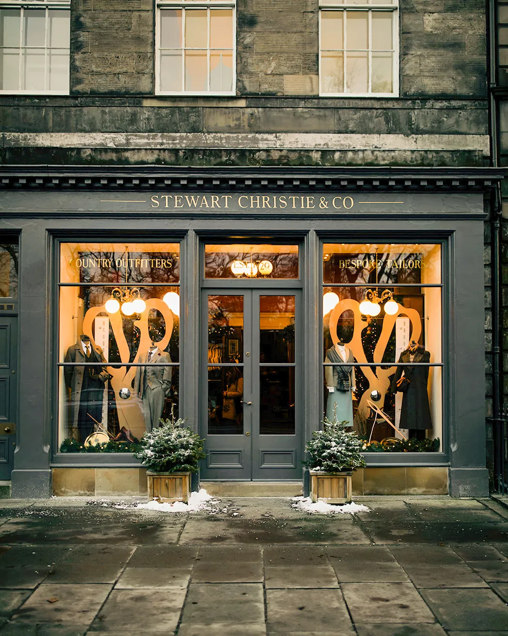Exterior view of Stewart Christie & Co. shop, showcasing men's tailored wear This is one of the most prestigious tailors in Scotland and the oldest tailor in the country. When I first visited Stewart Christie & Co, I was struck by the quiet elegance of the space it feels more like a private club than a retail shop. They’ve been tailoring kilts, tweeds, and formal garments since 1720, and their history shows in every detail.