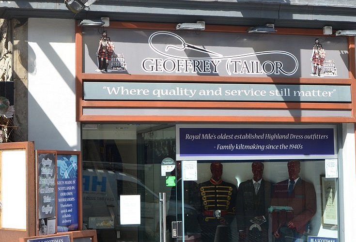 Storefront of Geoffrey (Tailor) Highland Crafts, a Scottish kiltmaker, with mannequins displaying traditional dress Geoffrey Highland Crafts operates from 555 Castlehill, Edinburgh EH1 2ND, on the Royal Mile. This family-run business, managed by Geoffrey and Lorna Nicholsby, specializes in traditional hand-sewn kilts and Highland dress.