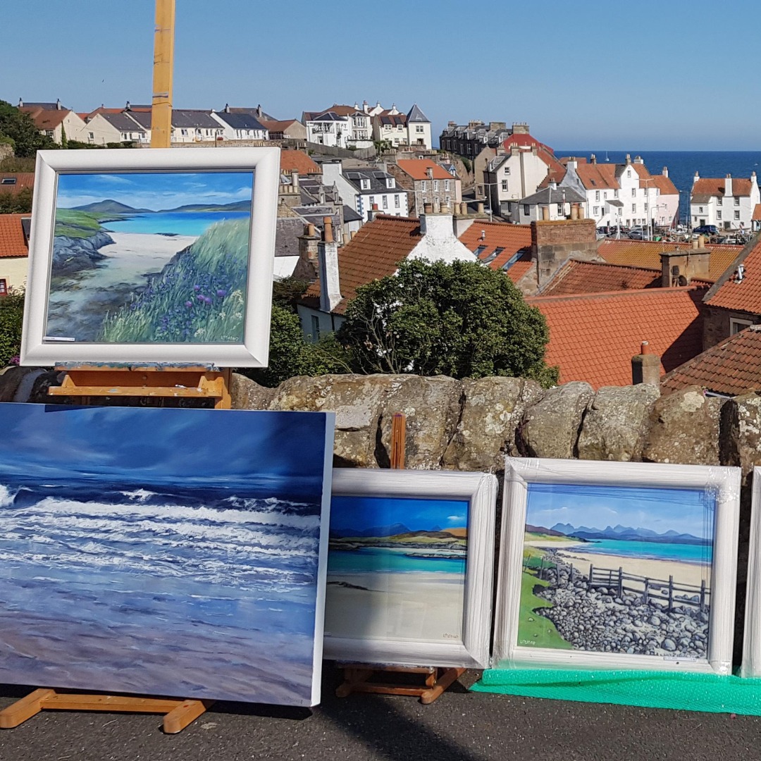 Artworks depicting seascapes and beaches displayed outdoors at the Pittenweem Arts Festival. Art is everywhere in Pittenweem. The village is best known for the Pittenweem Arts Festivalin August, when thousands of visitors flock here to see open studios, exhibitions, and performances. But even outside the festival, the artistic spirit is alive. - Independent galleries showcase paintings inspired by the shifting coastal light.