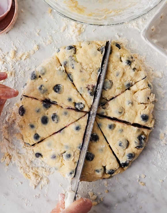 Next, shape the scones. On a lightly floured surface, press the dough into a flat circle about 1 inch thick. Cut it into 8 equal triangles. To keep the butter cold, put the scones in the freezer for 15 minutes while your oven heats up to 400°F.