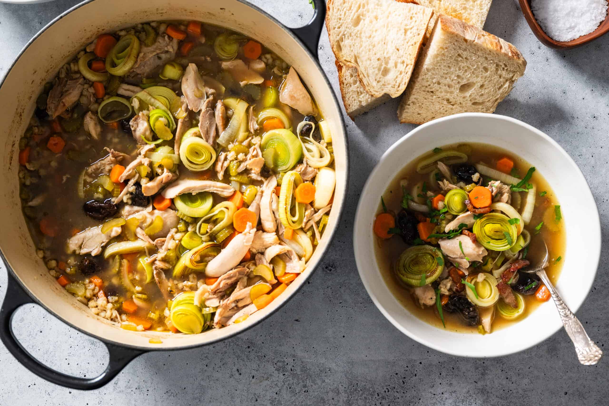 Cock-a-leekie soup is a timeless Scottish dish with roots stretching back centuries. At its core, it’s chicken and leeks simmered into a rich broth. Recipes vary by region, some add bacon, prunes, or spices, a nod to French influences from Scotland’s royal past.